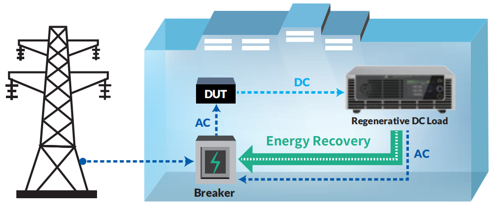 针对长时间烧机测试,可配置Chroma 63700能源回收式直流电子负载,将测试过程中消耗的能源回馈至厂内电网再利用,回馈效率最高达93%,有效降低能源的浪费并节省电力成本。