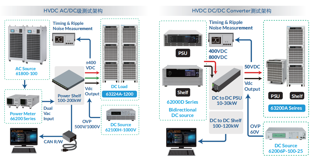 随着AI运算大功率需求,也有服务器系统采用HVDC电源构架。前级为AC电源转换±400Vdc或800Vdc的PSU及power shelf,后级±400Vdc输入的DC/DC电源转换成50Vdc的PSU及power shelf供电给服务器系统。Chroma具备完整系列的测量仪器,可符合产品规格与测试需求。尤其63200A直流电子负载,高电压1200V机种仍有足够电流拉载能力,来适用于50V输出的电源测试。另外62450D-2000HL双向直流电源,具有能源回收的负载功能,其双档位的设计,非常同时适用于400V或800V的测试应用。