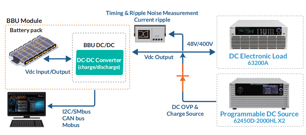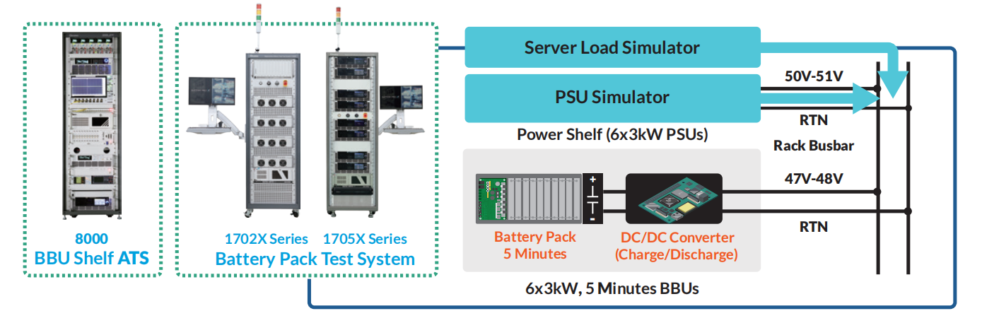 BBU在进行充放电测试时,必须进行瞬间大功率放电,以模拟电池备援电力模块的实际使用状况,同时撷取BMS状态数据进行比对分析。针对此需求,Chroma提供以Power Pro软件平台的功能验证自动测试系统,或生产线的EOL测试系统。另外也提供完整的耐久可靠度测试方案,支持续航力试验、功能检验及容量学习(Learning)等用途,确保产品可靠性与性能符合需求。