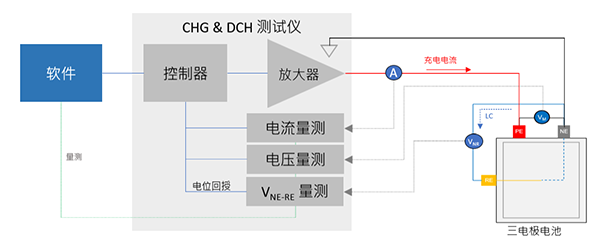 ▲图 1:三电极电池(3-Electrode Cell)测试架构与闭回路控制路径示意图