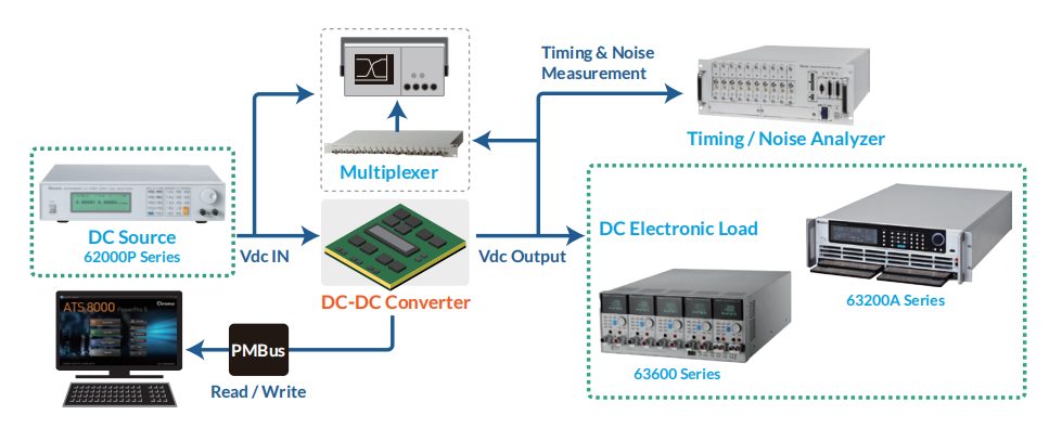 服务器内部的直流(DC-DC)转换器能将输入电压范围40V至60V转换为12V,每个转换器功率可达数千瓦,电流达上百安培。不仅需输出稳定的电压,转换效率需达到98%以上。部分元件如内存、CPU处理器、集成电路(ASIC)等使用低于12V的电压,同样需要DC-DC转换器进行调整。甚至AI服务器内部的GPU使用的Vcore电源模块需将电压降至1V以下,同时输出电流需达到上千安培。Chroma的电源测试方案包含直流电源与高性能电子负载,可满足各种直流需求。转换器的规格。其高精度的测量功能满足测试效率的要求。此外,还可灵活配置仪器组成Chroma 8000自动化测试系统,全面验证直流转换器的规格与性能,也可应用于生产线进行高效测试。