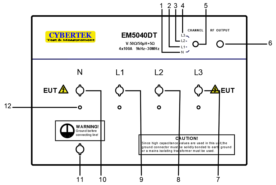 10(被测设备(EUT))供电接口:N 相被测设备电源接口,该螺栓尺寸为 10mm。