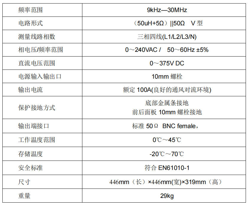 EM5040DT 人工电源网络是一款(50uH+5Ω)||50Ω V 型 三相 LISN(Line Impedance Stable Network)。该产品能在 9kHz—30MHz 射频范围内为被测试设备端子和参考地之间提供稳定的阻抗,同时又将来自电网的无用信号与测量电路隔离开,仅将被测试设备的干扰电压耦合到测量接收机的输入端。该产品的性能符合 CISPR16-1-2:2006 标准要求,适用于三相设备传导骚扰电压测量。标准的 BNC 输出接口和 50 欧姆输出阻抗,可匹配任何厂家的接收机、频谱仪等测量设备。
