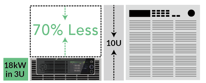 高功率密度设计,相同18kW的电子负载,可减少70%的体积,改善高功率电子负载体积大、移动不便的情况,能为实验室节省不少空间。